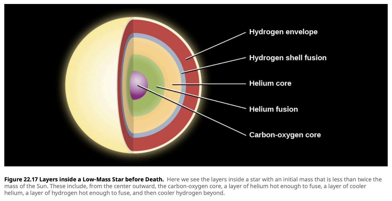 - E. A star that has no nuclear reactions going on in the core but is fusing hydrogen to form helium in a shell around the core.